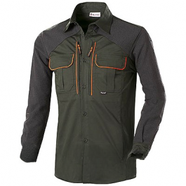 Camicia uomo in cotone elastico in due direzioni. Rinforzi in tessuto antiabrasione sulle spalle e sulle maniche. Rifiniture ad alta visibilità orange fluo. Chiusura con bottoni. Due tasche al petto con cerniera a scomparsa e sovrastanti taschini con pattina a velcro. Polsini con bottone.