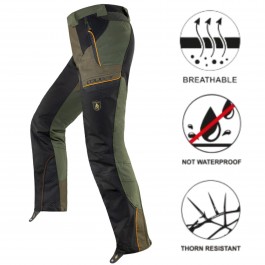 COUGAR 4.0 è un pantalone con tecnologia THORN SHIELD®: sviluppata da TRABALDO®, è una speciale struttura tessile in grado di migliorare sensibilmente la resistenza alla perforazione, riducendo fastidiosi danni all’epidermide causati dall'utilizzo in ambienti spinosi. Per conferire vestibilità sinuose e confort di calzata, nella quarta generazione abbiamo utilizzato la nuova culatta in KETRTEX bi-stretch, che in unione alla confort-zone lombare non vi farà percepire di indossare un pantalone così rinforzato.