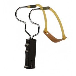 Fionda in metallo senza appoggio, impugnatura in plastica ergonomica elastico in Caoutchouc e patella in cuoio.