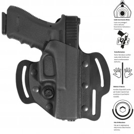 È dotata di un doppio passante per cintura che ne stabilizza la posizione, mantenendo l'arma con un'inclinazione ideale per l'estrazione rapida.